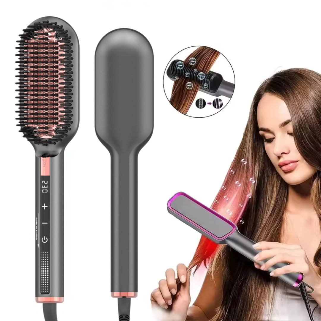 Die Balany Dampfglättbürste kombiniert Wärme mit feinem Wasserdampf. Der Dampf spendet Feuchtigkeit, während die Bürstenplatten das Haar schonend glätten. So wird dein Haar nicht ausgetrocknet, sondern bleibt geschmeidig und glänzend.